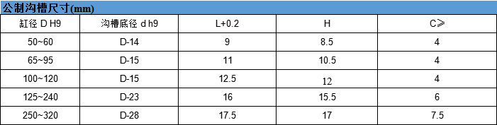 標準材料密封環:填充聚四氟乙烯F-PTFE或聚氨酯PU0形圈:丁腈橡膠NBR擋 圈:尼龍PA或聚甲醛POM特點-良好的動靜密封性能-靜態和動態的摩擦系數低磨損小-溝槽結構簡單-啟動時不爬行,工作平穩-可允許較大的擠出間隙-由于較大的擠出間隙,在有污物的介質中可安全使用 -使用壽命長